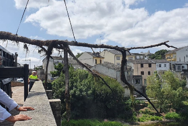 Comeza a retira os restos vexetais ancorados nas pilastras da Ponte Vella do Río Miño como paso previo á súa restauración