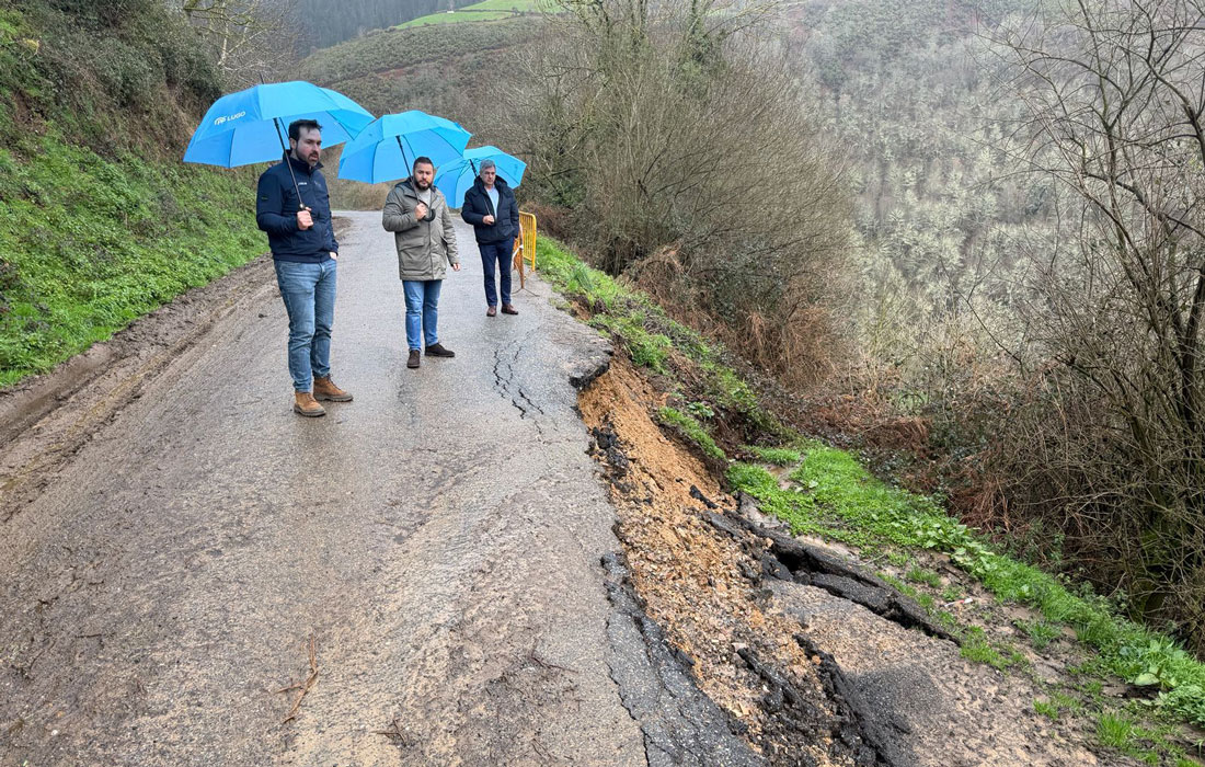 Los diputados del Grupo Provincial Popular exigen la reparación inmediata de la carretera provincial LU-P-1402, en Cervantes, cortada por desprendimientos y el derrumbe del firme provocado por las intensas lluvias. Antonio Ameijide y Jesús Núñez, junto al portavoz del PP en Cervantes, Óscar Fernández, visitaron la zona afectada para comprobar los daños.