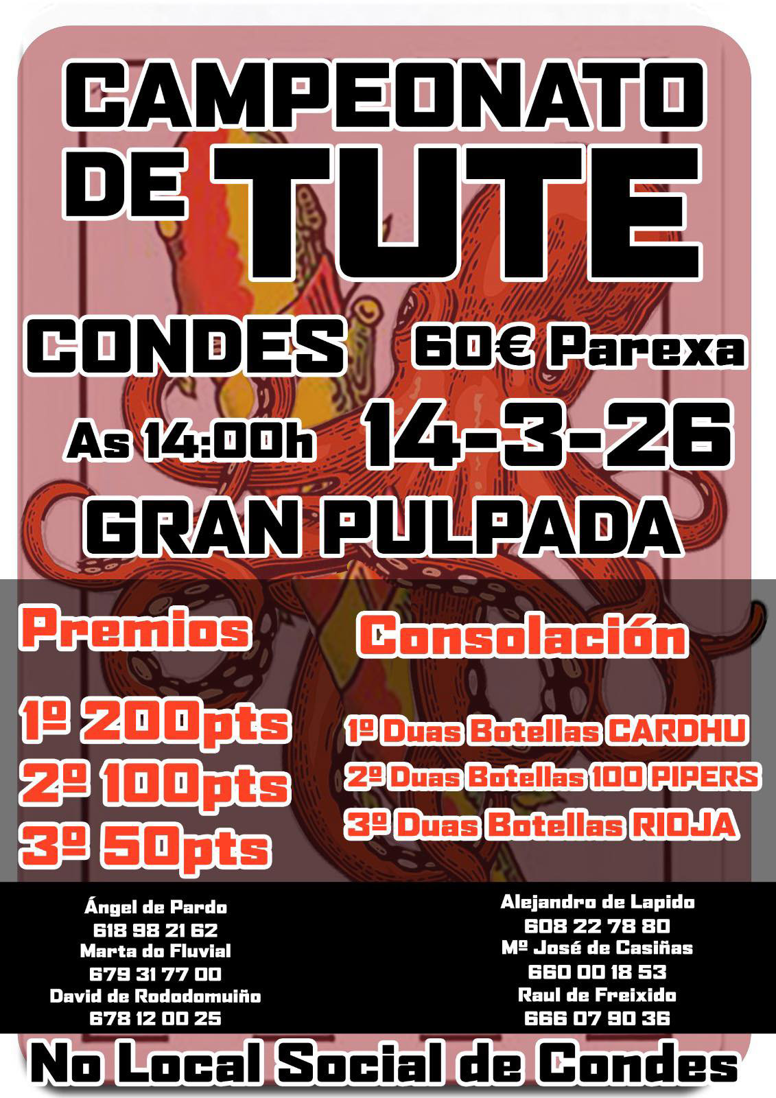 O evento estará acompañado dunha gran pulpada, ofrecendo aos asistentes a oportunidade de combinar a emoción do xogo cunha degustación gastronómica. A organización, a cargo da comisión de festas, agradece a colaboración da veciñanza e anima a todos os interesados a participar. Para inscribirse ou obter máis información, pódese contactar cos membros da organización nos números facilitados.