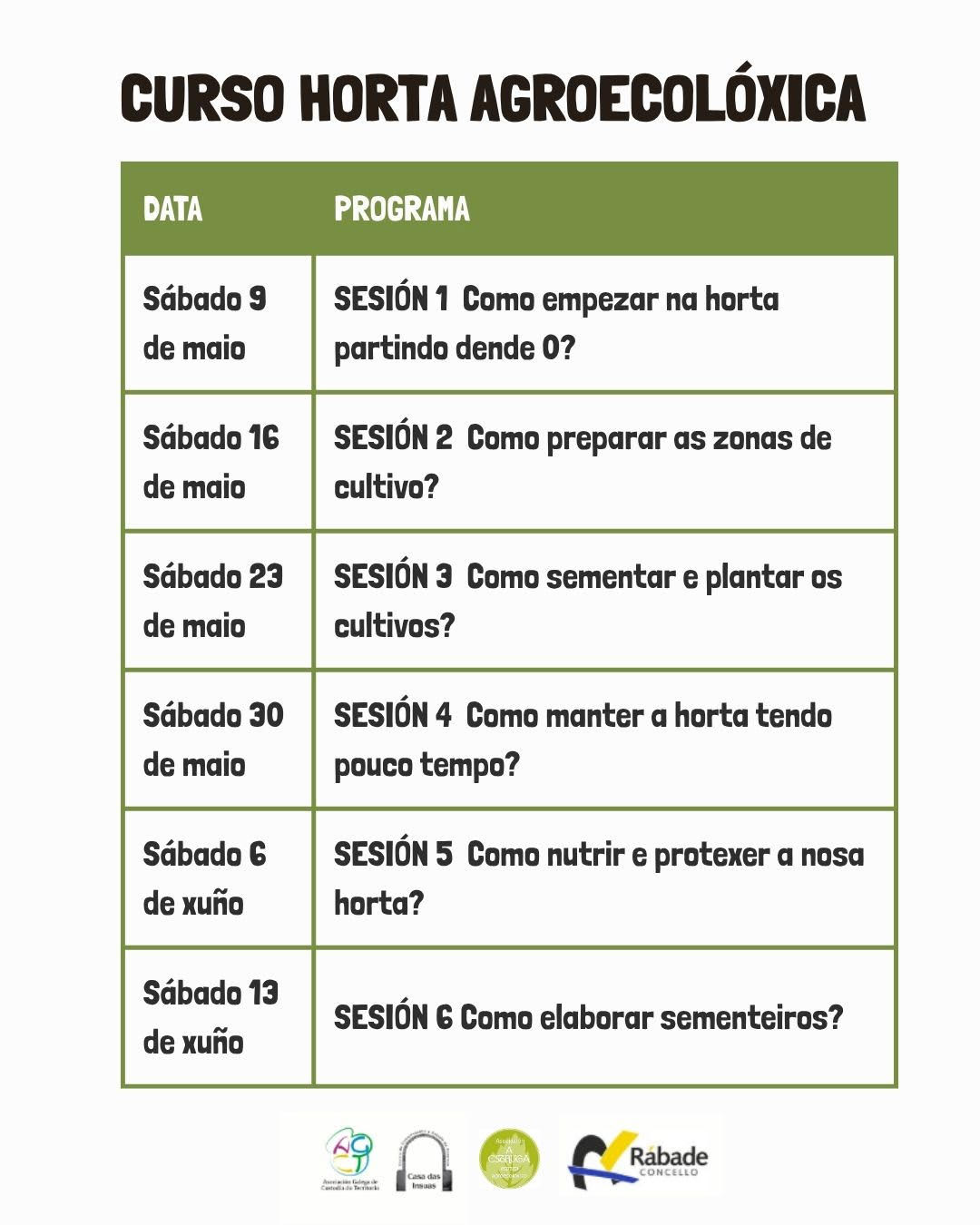 A formación, que conta un ano máis coa colaboración de Amanda López, da Asociación Agroecolóxica A Estruga, desenvolverase entre o 9 de maio e o 13 de xuño a través de seis sesións consecutivas que terán lugar os sábados en horario de mañá, de 10:00 a 13:00 horas. O programa combina contidos teóricos e prácticos adaptados a todos os niveis de experiencia.
