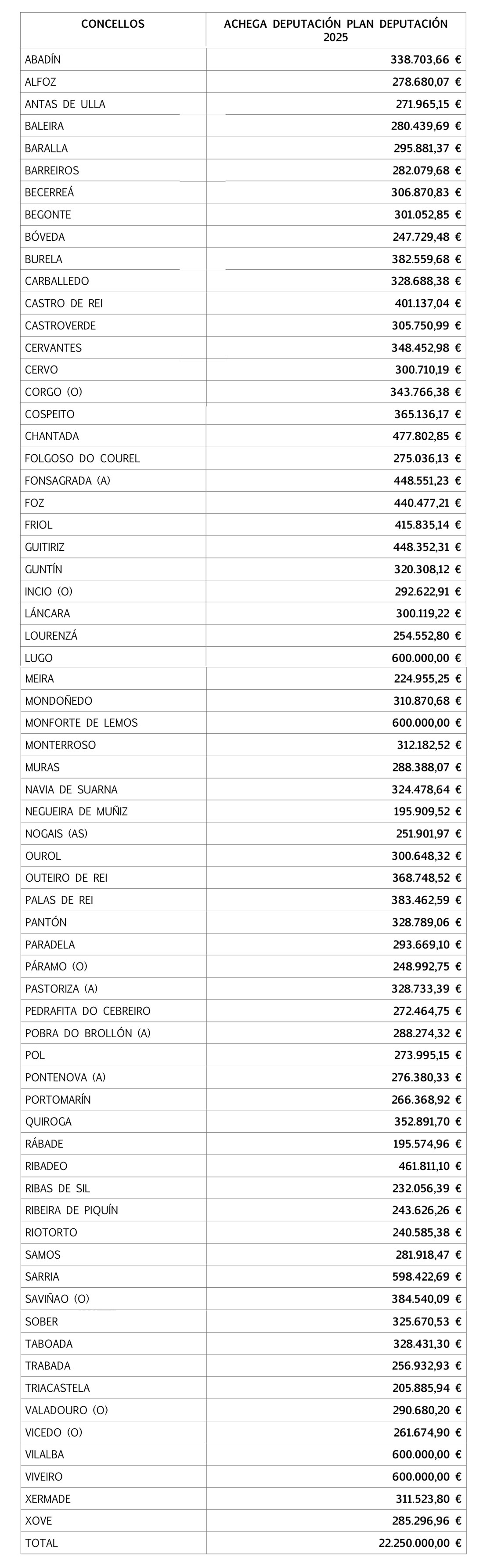 O Pleno Ordinario da Deputación de Lugo celebrado este martes vén de aprobar as bases do Plan Deputación de Lugo de Cooperación cos Concellos 2026, que sobe ata os 22,25 millóns de euros. Esta ferramenta de cooperación económica e técnica entre a Administración provincial e os municipios segue criterios públicos e obxectivos -a poboación, o índice de envellecemento ou a dispersión territorial- e mantén un respecto total á autonomía municipal. O programa de investimentos saíu adiante grazas aos votos a favor do PSdeG, do BNG e do deputado non adscrito, e a abstención do Partido Popular.
