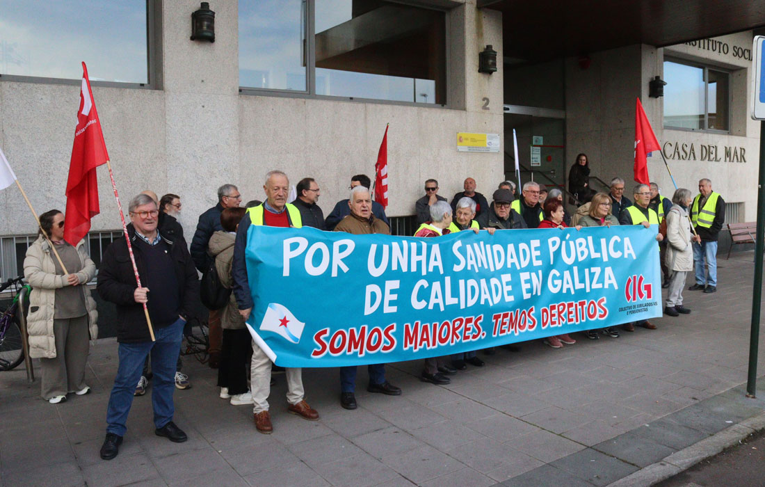 O colectivo de persoas xubiladas e pensionistas da CIG concentrouse esta mañá en centros de saúde da Coruña, Ferrol, Ourense, Pontevedra, Compostela e Vigo, así como na porta principal do HULA en Lugo, para reivindicar a defensa da sanidade pública e o dereito a unha atención sanitaria digna e equitativa para todas as galegas e galegos.